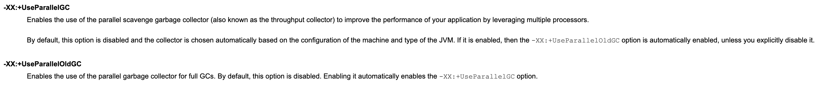 찾은 것이 비록 Oracle 이지만 ParallelGC 옵션은 추가로 설정을 하지 않는 이상 ParallelOldGC 옵션을 활성화 시키며 ParallelOldGC는 ParallelGC를 자동으로 활성화 시킨다고 되어있습니다.