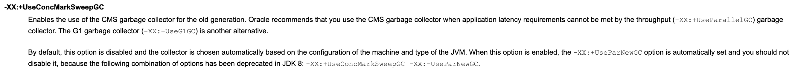 ParallelGC 설명 또한 ConcMarkSweepGC는 활성화 시 ParNewGC가 자동으로 활성화 되고 역으로도 마찬가지라고 설명이 되어있습니다.