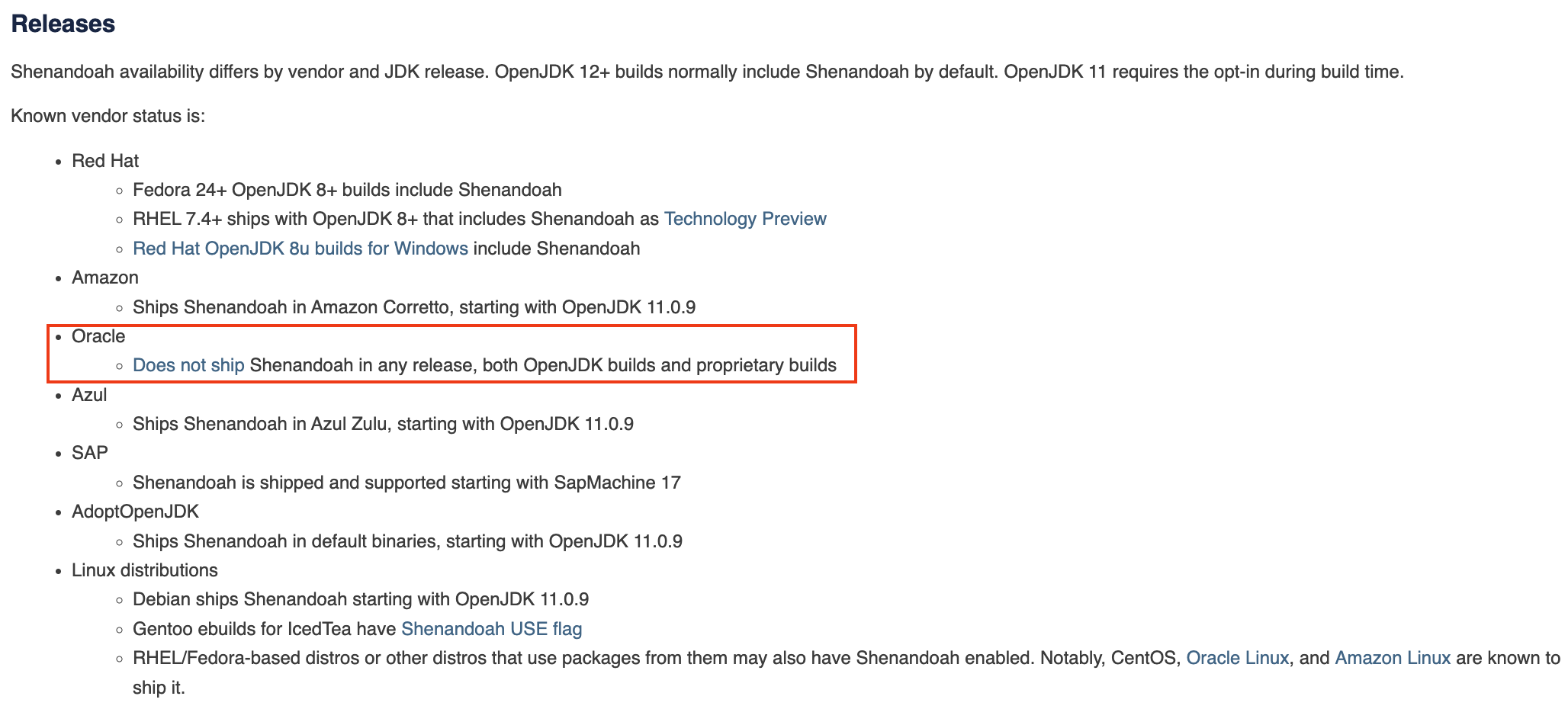 다만 Oracle에서는 ShenandoahGC가 확인되지 않는데 이는 Openjdk 홈페이지에서도 확인이 가능합니다.