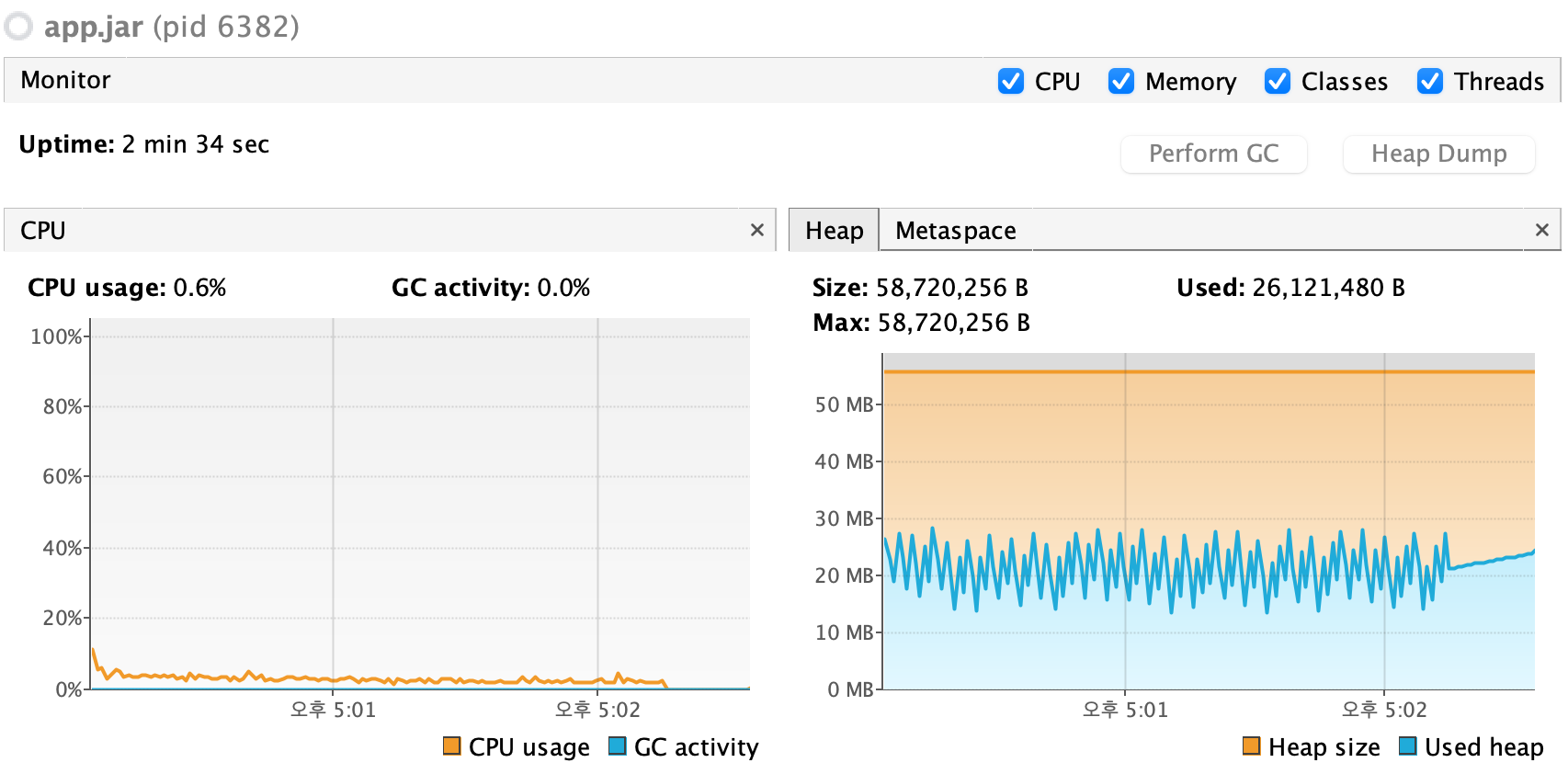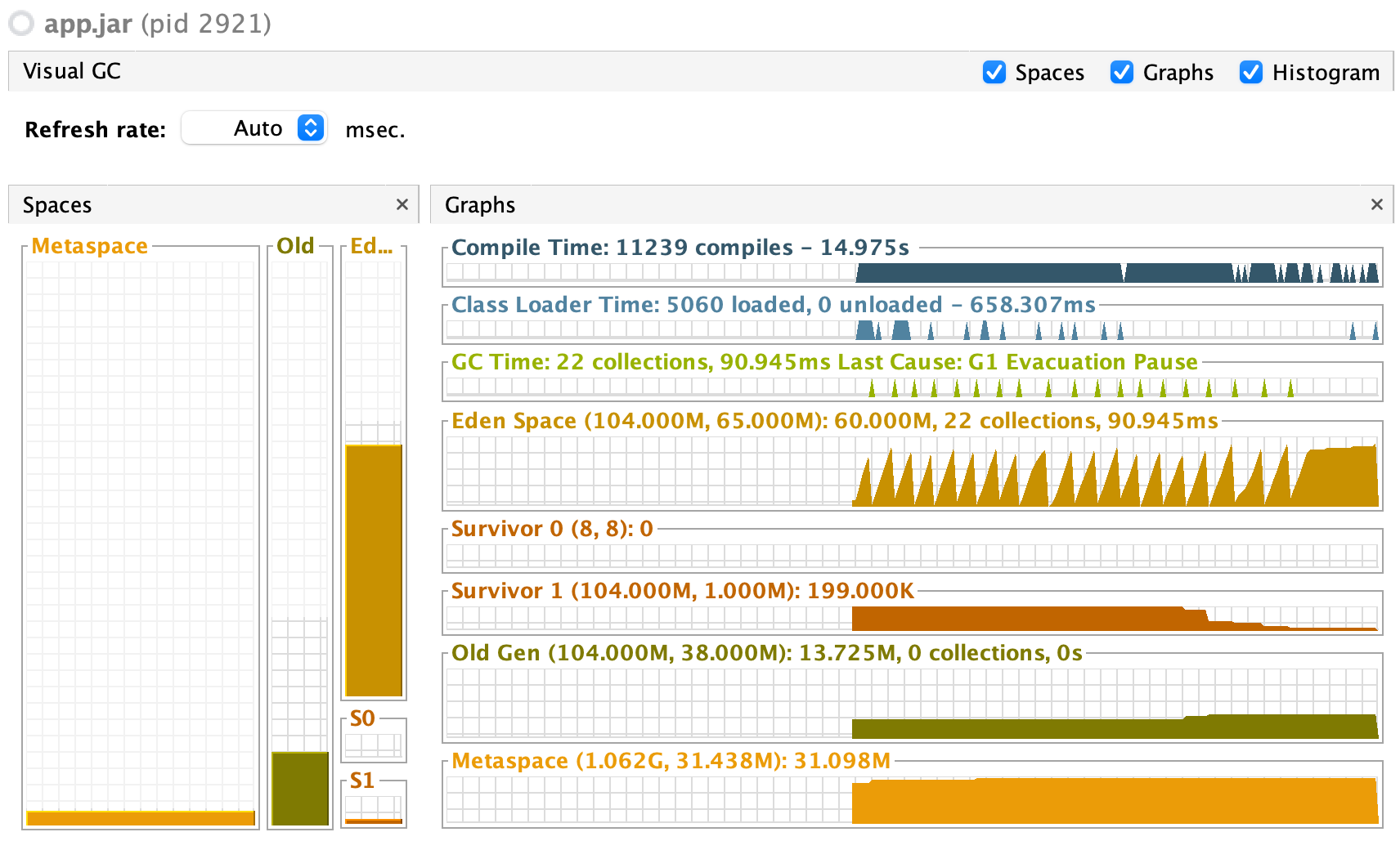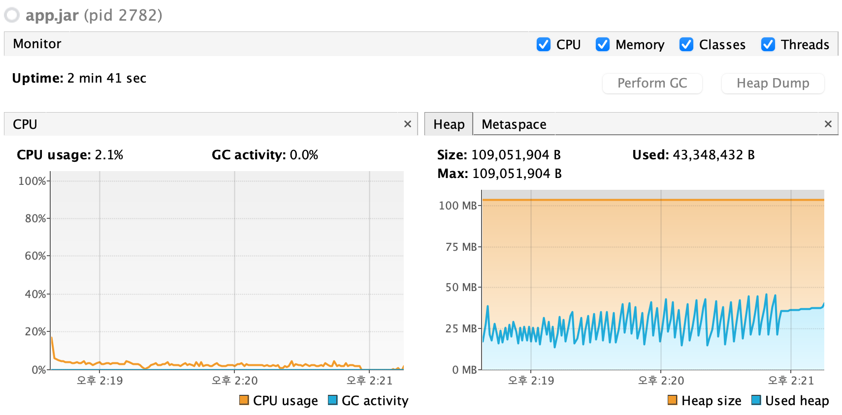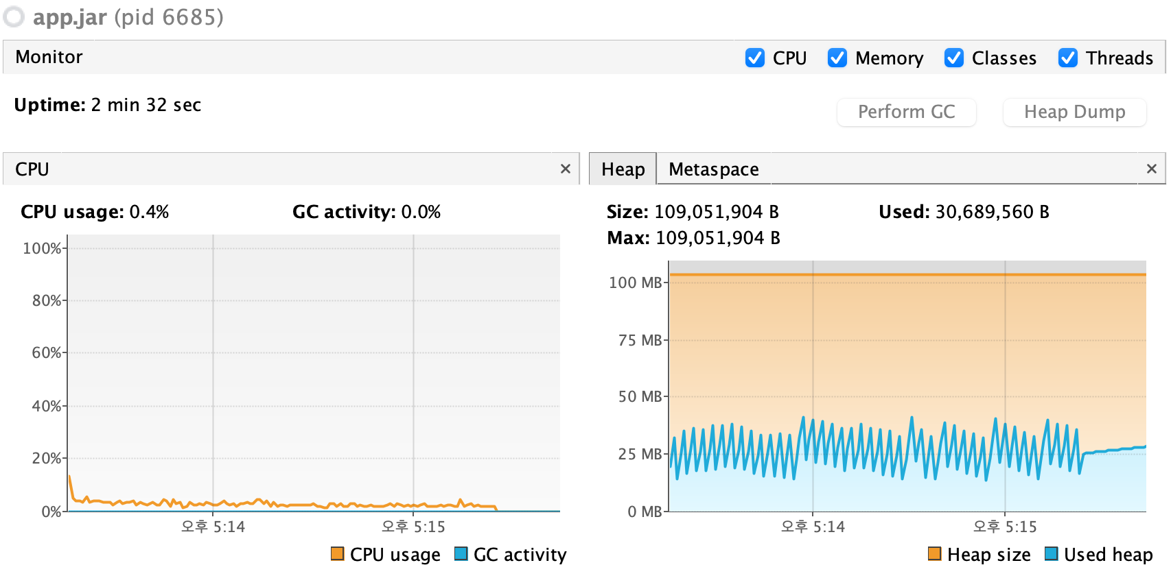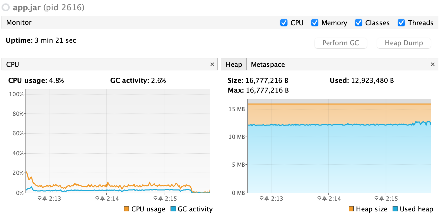 테스트 환경은 Java17에 OpenJDK 이며 모니터링으로는 VisualVM + VisualGC 와 jstat을 사용하였습니다.