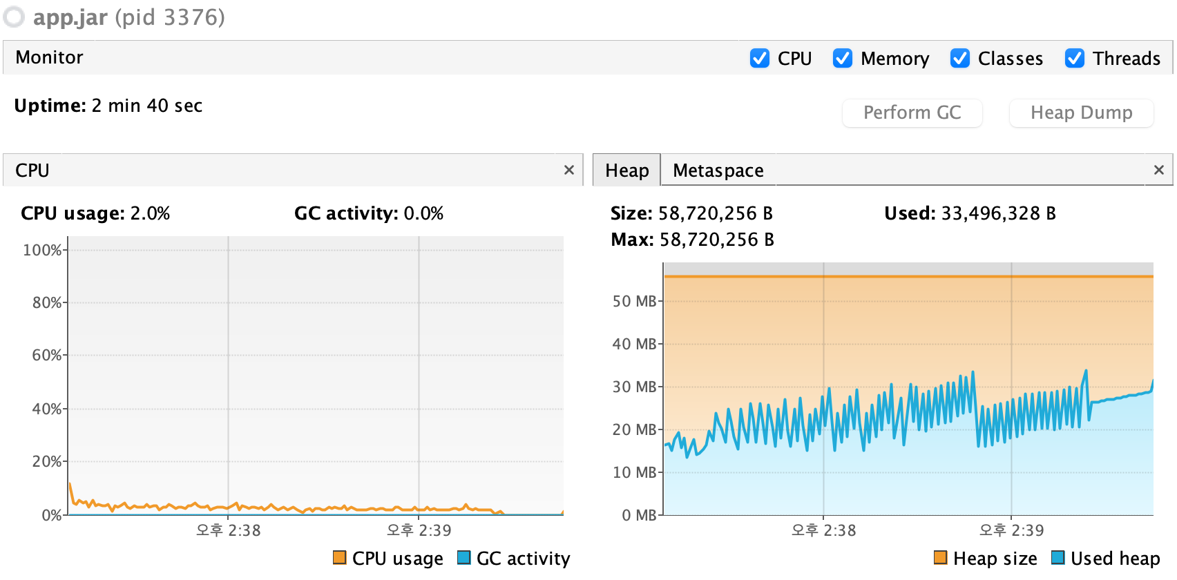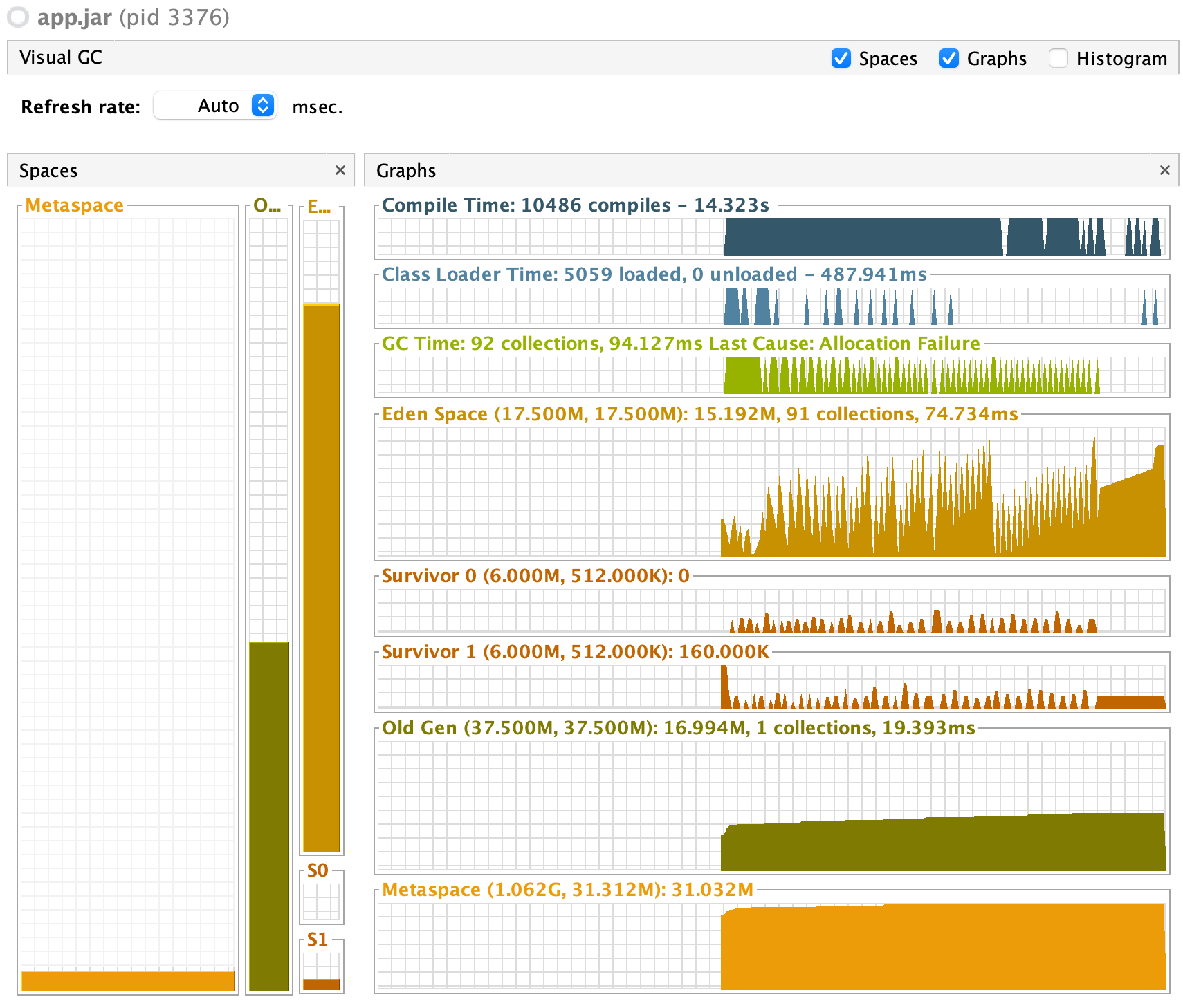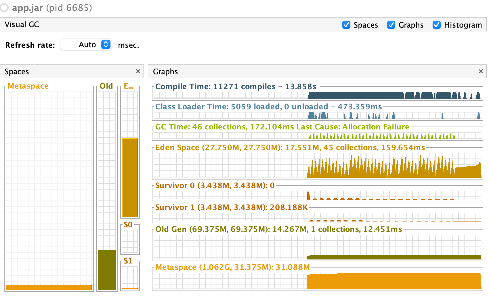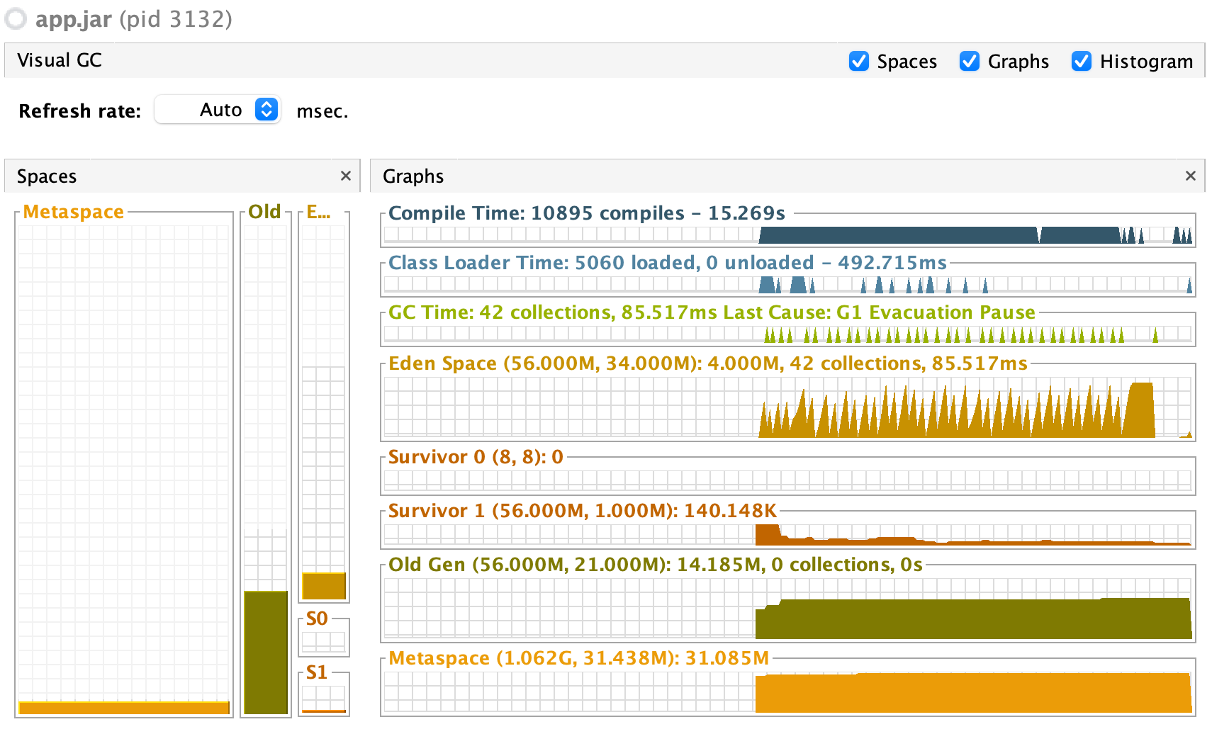 테스트 환경은 Java17에 OpenJDK 이며 모니터링으로는 VisualVM + VisualGC 와 jstat을 사용하였습니다.