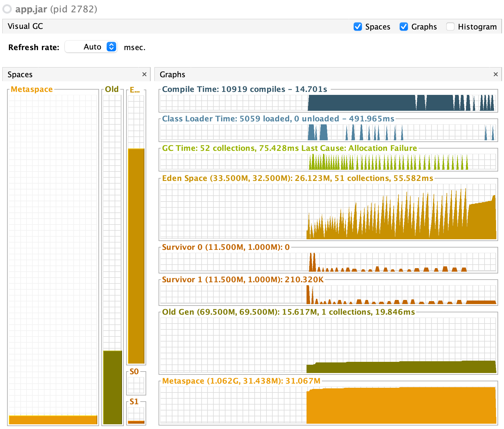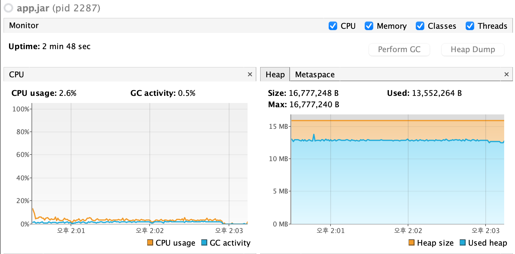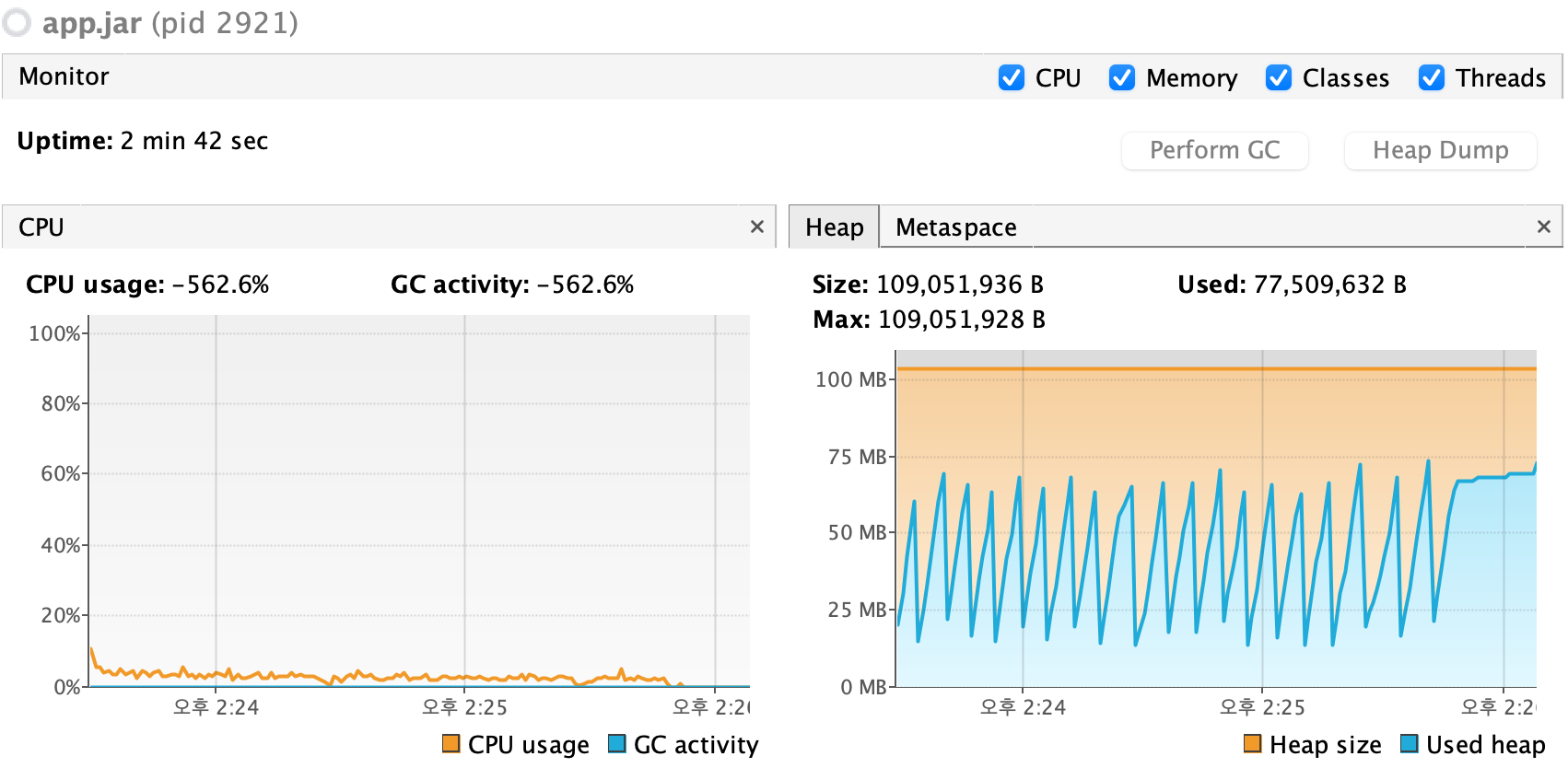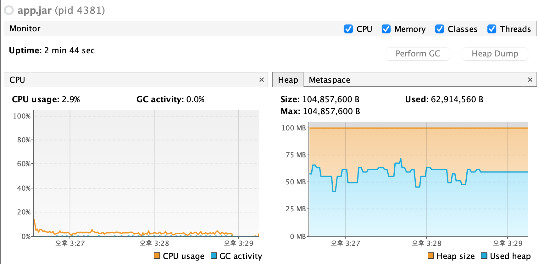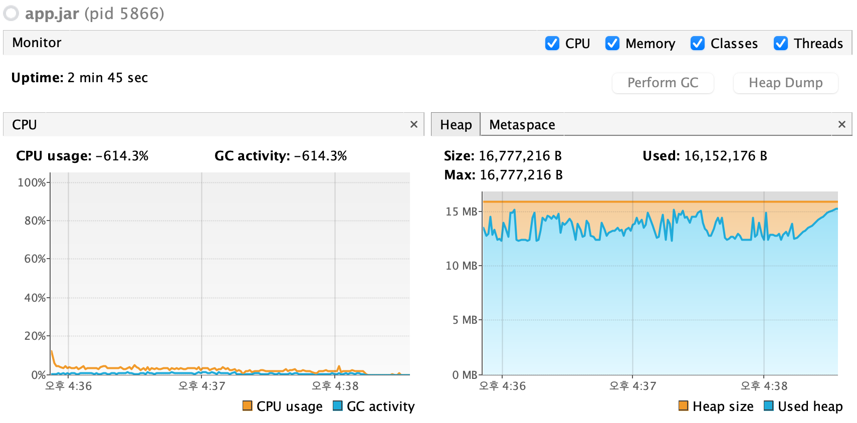 테스트 환경은 Java17에 OpenJDK 이며 모니터링으로는 VisualVM + VisualGC 와 jstat을 사용하였습니다.